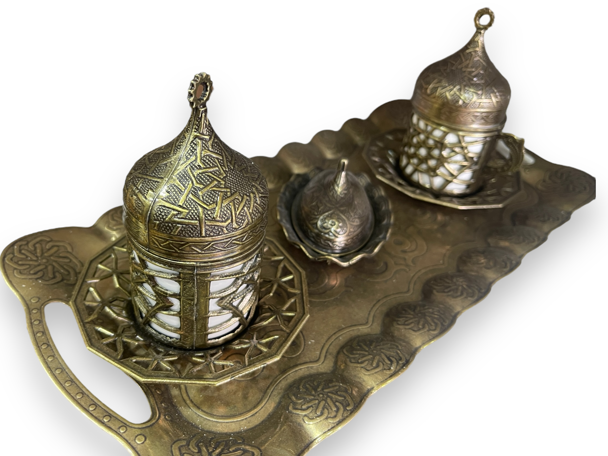 Kahve sunumu için şık ve dekoratif set. Taş detayları el işçiliğidir. METAL DÖKÜMDÜR.